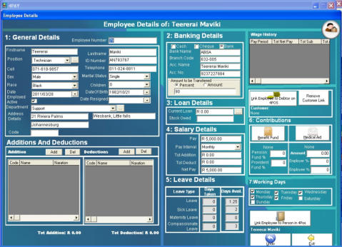 A complete Payroll system that can run independentlyOr -Can be used with 4POS or 4CLOCK!The 4PAY system has been designed with simplicity in mind and allows you to :Create all your employees with their static info; Name, address, telephone number, ID, passport details, leave allowed, leave taken (A proper leave register!), Loan register detailing loans taken, monies deducted & balance due!Payroll Additions w.r.t. bonusses, allowances eg, car, equipment & clothing can be entered & specified as taxable or not.Similarly, payroll deductions can be dealt with!Also, if you are using 4POS as your POS system, you can link these employee purchases to deduct stock purchased during the month or week.4PAY interfaces with our own 4CLOCK - a time-recording system that will track (With fingerprint / Biometric reader or Swipe card or simple codes) all staff logging in & out. On log-out the 4CLOCK can be configured to prompt for reasons logging out eg. Smoke break, Lunch, delivery etc.4PAY will deduct all required details when configured, Eg. Tax, UIF, Medical Aid etc by amount or percentage of gross salary.HR Functions :Makes notes of all incidents eg. Warning, disciplinary hearings etc.Print Employment contracts, Final settlements & Leave Forms.Reports available :Wage slips with coinage analysisCoinage reports to make your cash collection easier.Banking report to see which staff is being paid with bank transfers!Additions report by department.Deductions report by department.Medical aid etc contributions reports. (Both employees & employer)Automatic tax tables imported yearly. Import of any Countries Tax Tables!